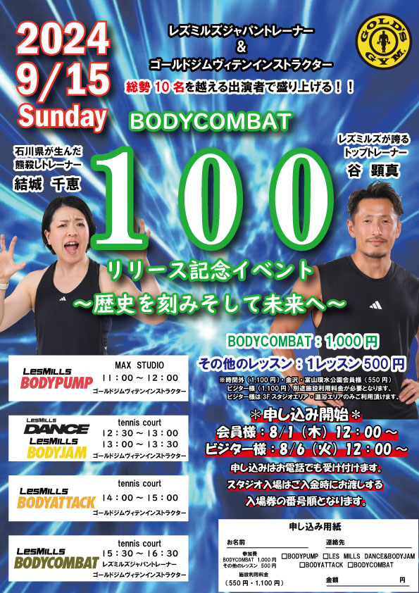 日本で最も人気のあるプログラムのひとつ、BODYCOMBATは、空手やボクシング、テコンドーなど、様々な格闘技の動きを取り入れたハイエナジーワークアウトです。今年リリース100を迎えるにあたり、全国各地で記念イベントが開催されます。各イベント情報は、以下に随時アップデートしていきます。