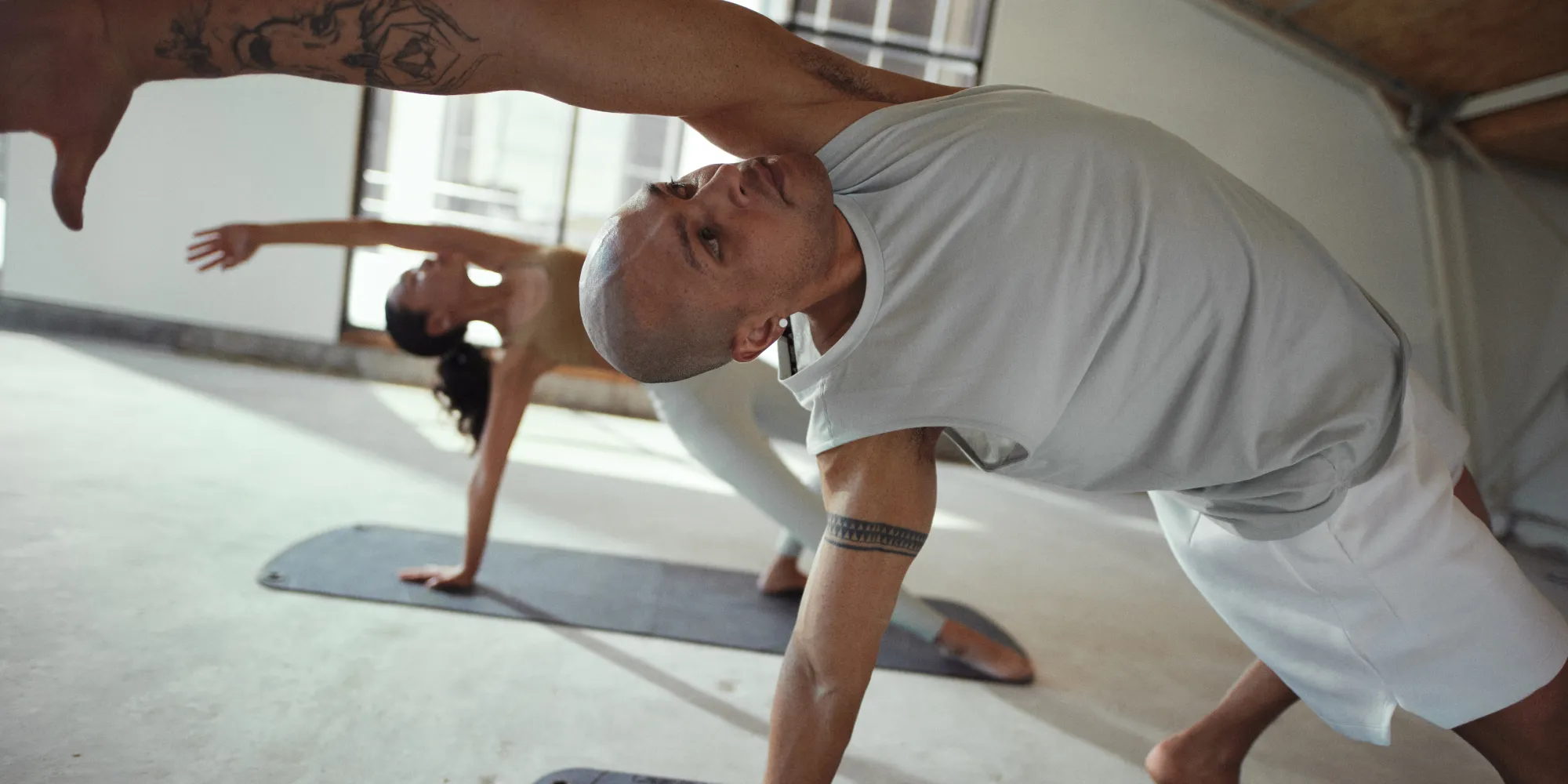 A male and female each laying on a yoga mat